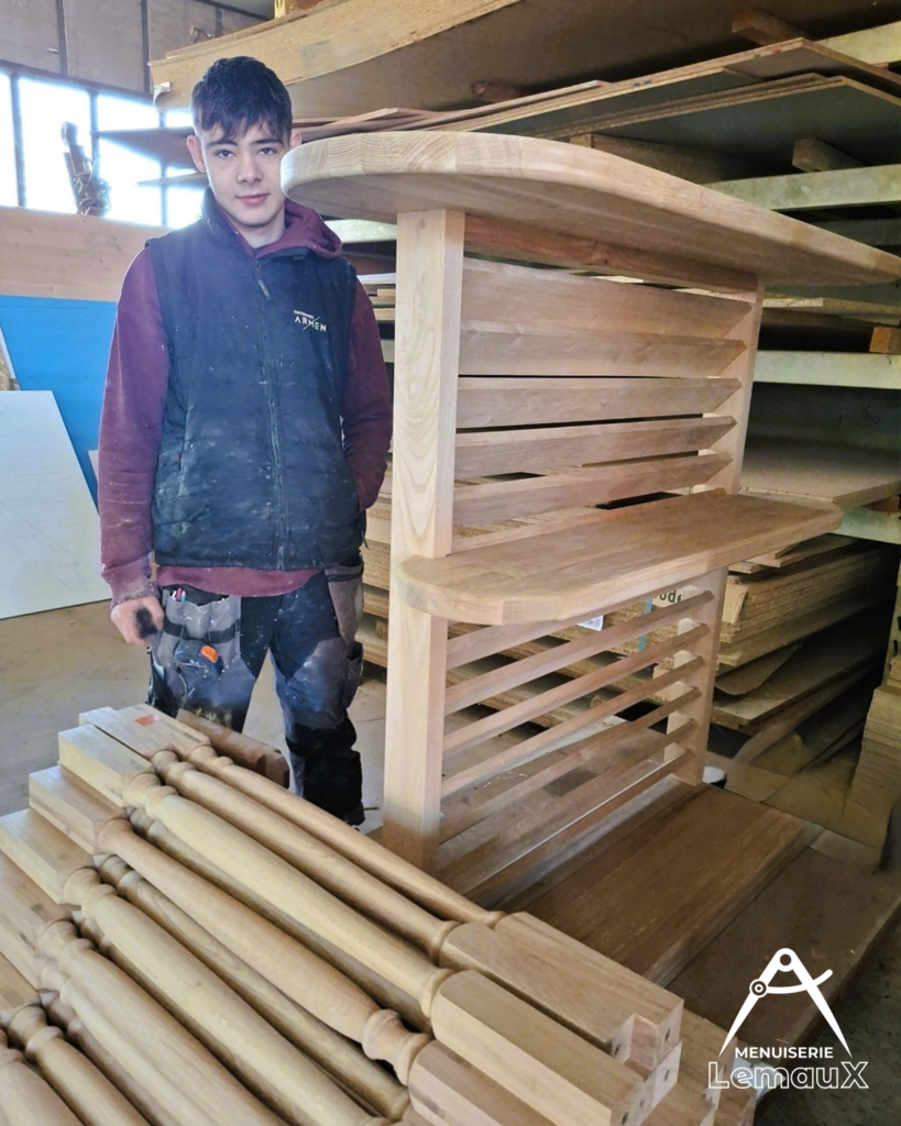 Cette fabrication met aussi en lumière le savoir-faire de Mathis. Aux côtés de compagnons expérimentés, il développe chaque jour ses compétences et contribue pleinement à la qualité des réalisations. Il apporte ainsi déjà énormément tout en se perfectionnant au contact de l’équipe.